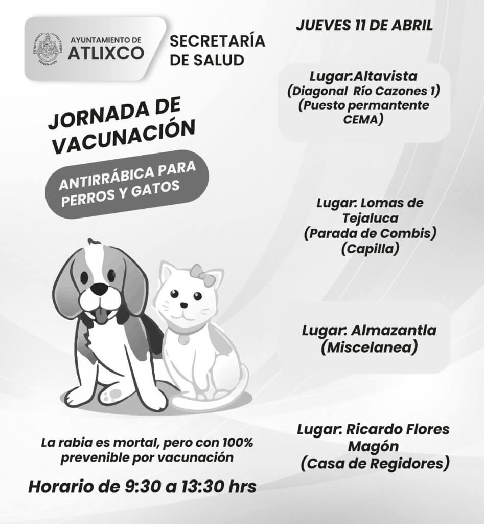 Las autoridades invitan a consultar las redes sociales del Ayuntamiento de Atlixco para conocer los horarios y puntos que visitarán, además, indicaron que la vacuna antirrábica es aplicada a los animales sanos a partir del primer mes de edad, con refuerzo al cumplir tres y seis meses de edad, después de ello, cada año.